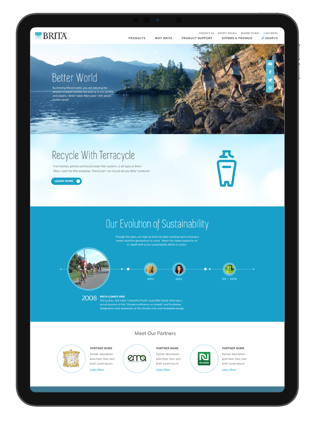 For the Brita Sustainability page, I designed the entire experience, which needed to feature a timeline, so I created a visually compelling interactive timeline that guides the user through the history of sustainability projects sponsored by Brita.