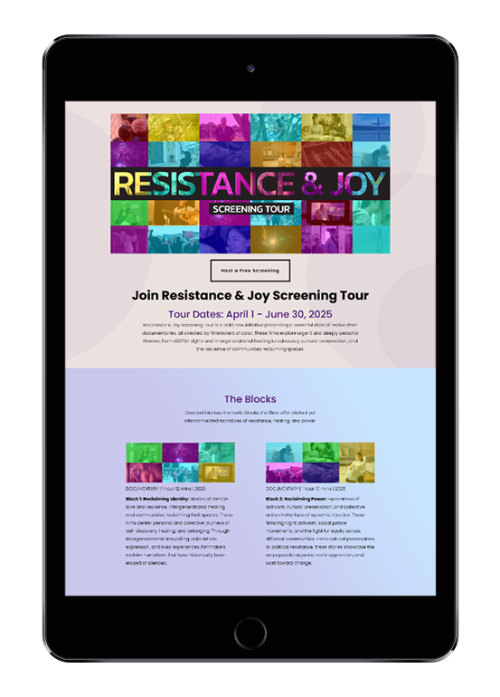 Resistance & Joy Screening Tour is a bold new initiative presenting a powerful slate of twelve short documentaries, all directed by filmmakers of color. These films explore urgent and deeply personal themes, from LGBTQ+ rights and intergenerational healing to advocacy, cultural preservation, and the resilience of communities reclaiming spaces.