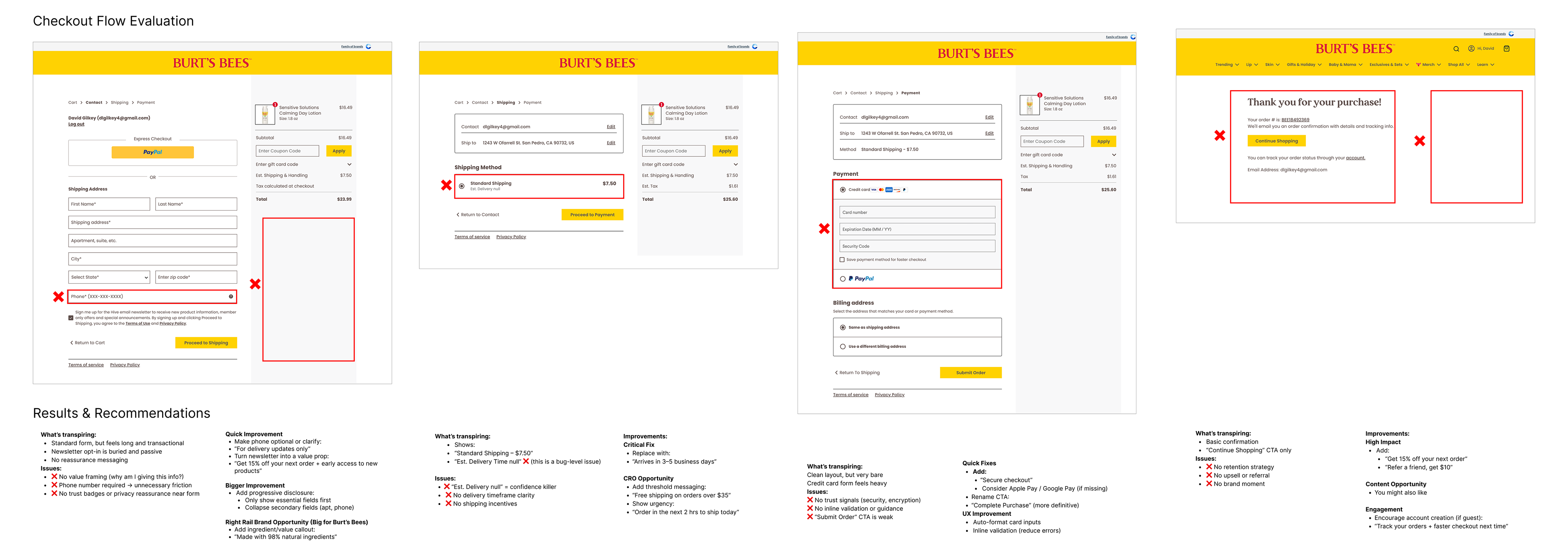 Burt’s Bees’ checkout experience was functional but lacked key conversion-driving elements. While users were able to complete purchases, the flow missed opportunities to reduce friction, reinforce trust, and drive higher completion rates.