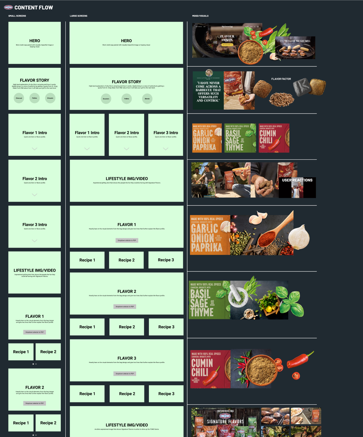 Knowing that the client/decision-makers would need help envisioning what would be seen as a design/experience for the page, I wanted to paint a crystal-clear picture for them. I combined the content flow with the mood board in my presentation. It was well received, and they gave the green light to build.