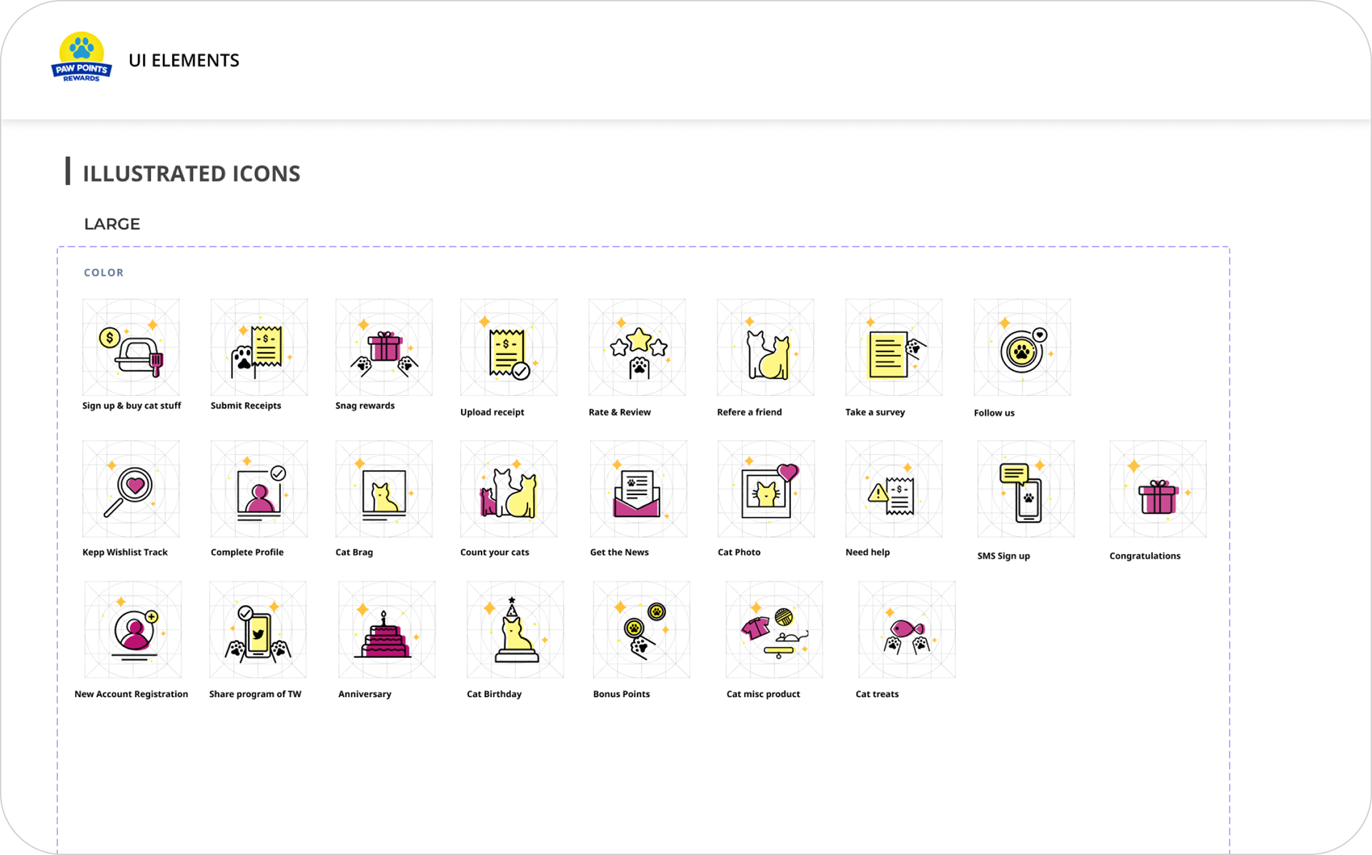 Paw Points Rewards needed its site/app components and iconography to be as playful and fun as its primary subject, cats. A vibrant color palette was selected for the icons, paired with thin lines and strokes. Additional character was added by using an offset color fill. The illustrations carry through the whimsical, playful look and feel.